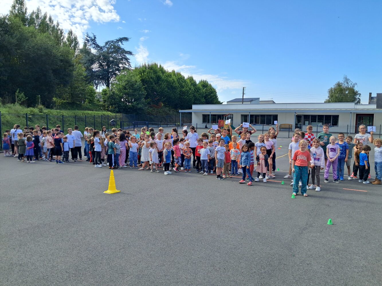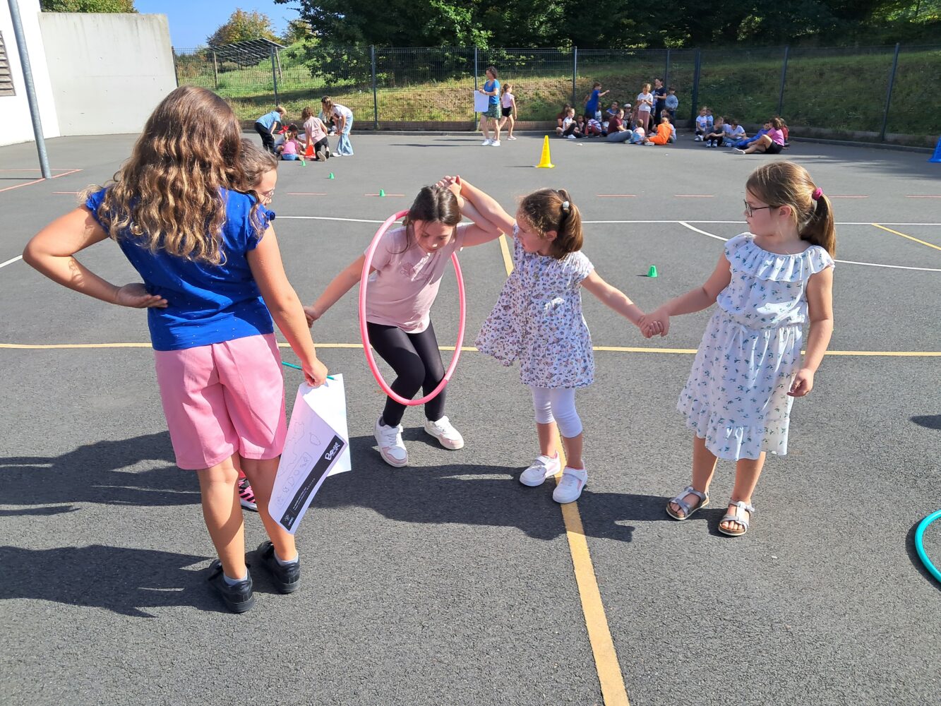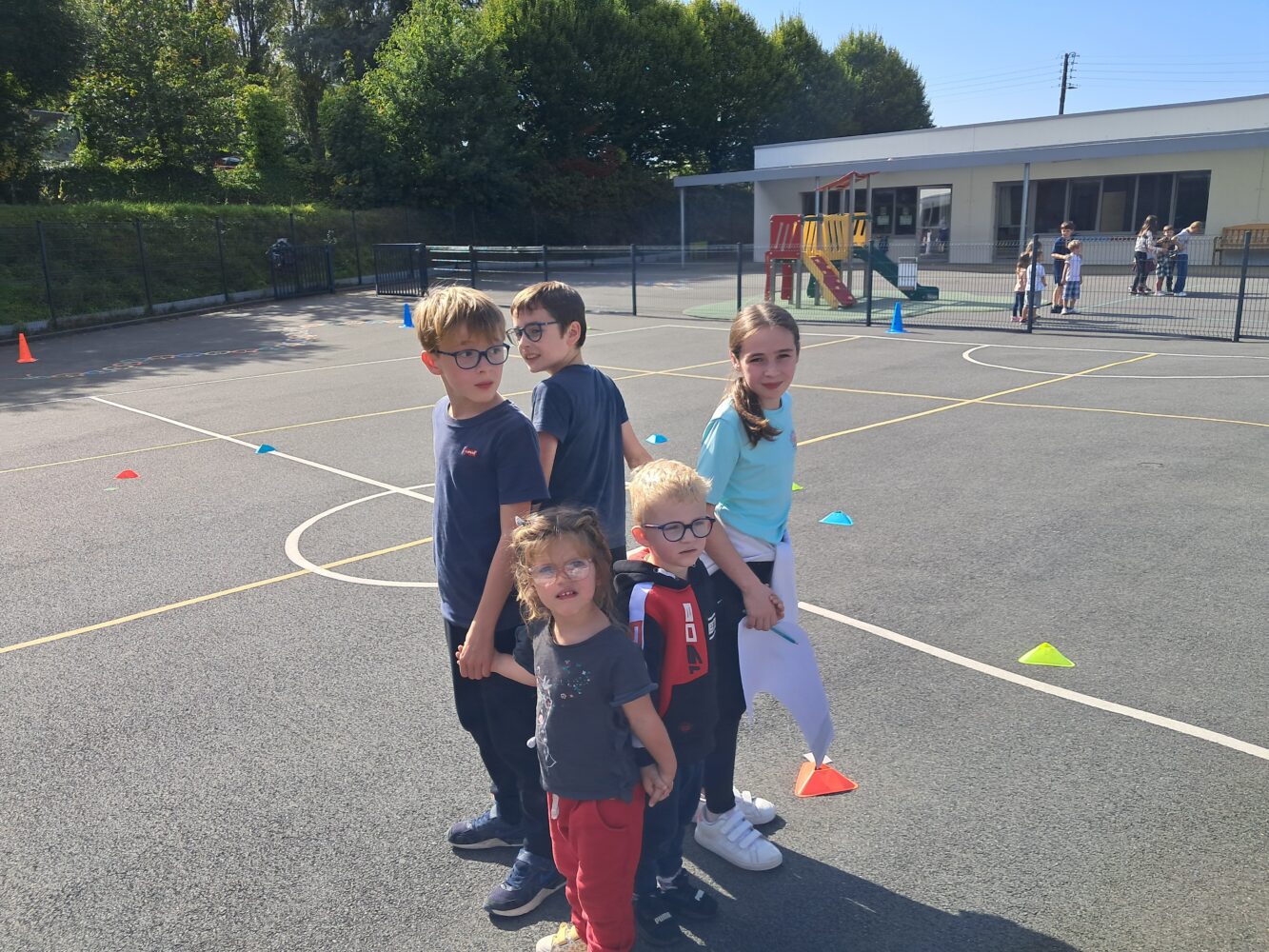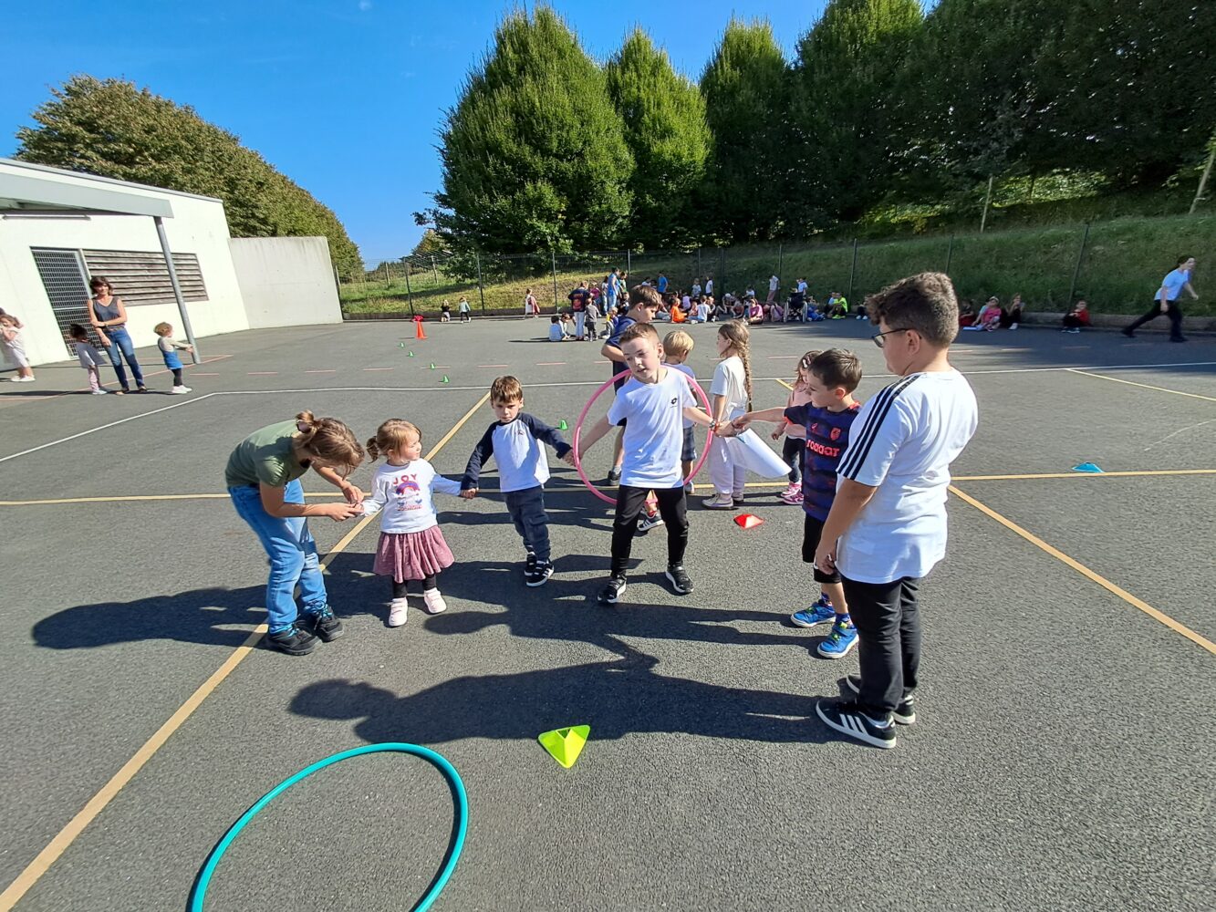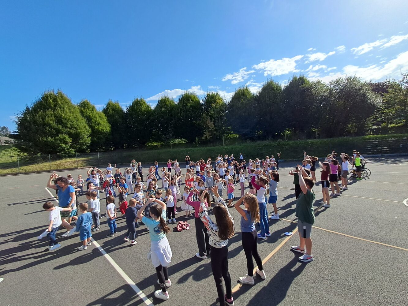 Ce vendredi après-midi 19 septembre, le soleil et la chaleur ont accompagné tous les élèves de l’école pour réaliser le jeu collectif de rentrée. Il fallait allier des compétences intellectuelles sur les régions de France à des postures sportives telles des rondes inversées, des passages de cerceau dans une chaîne humaine, des marches à reculons ou des mouvements d’athlétisme… Et pour finir, une chorégraphie sur la chanson « Unis comme des frères » de Hopen !