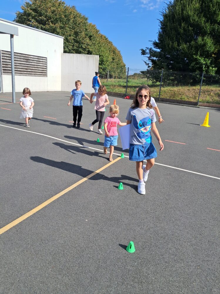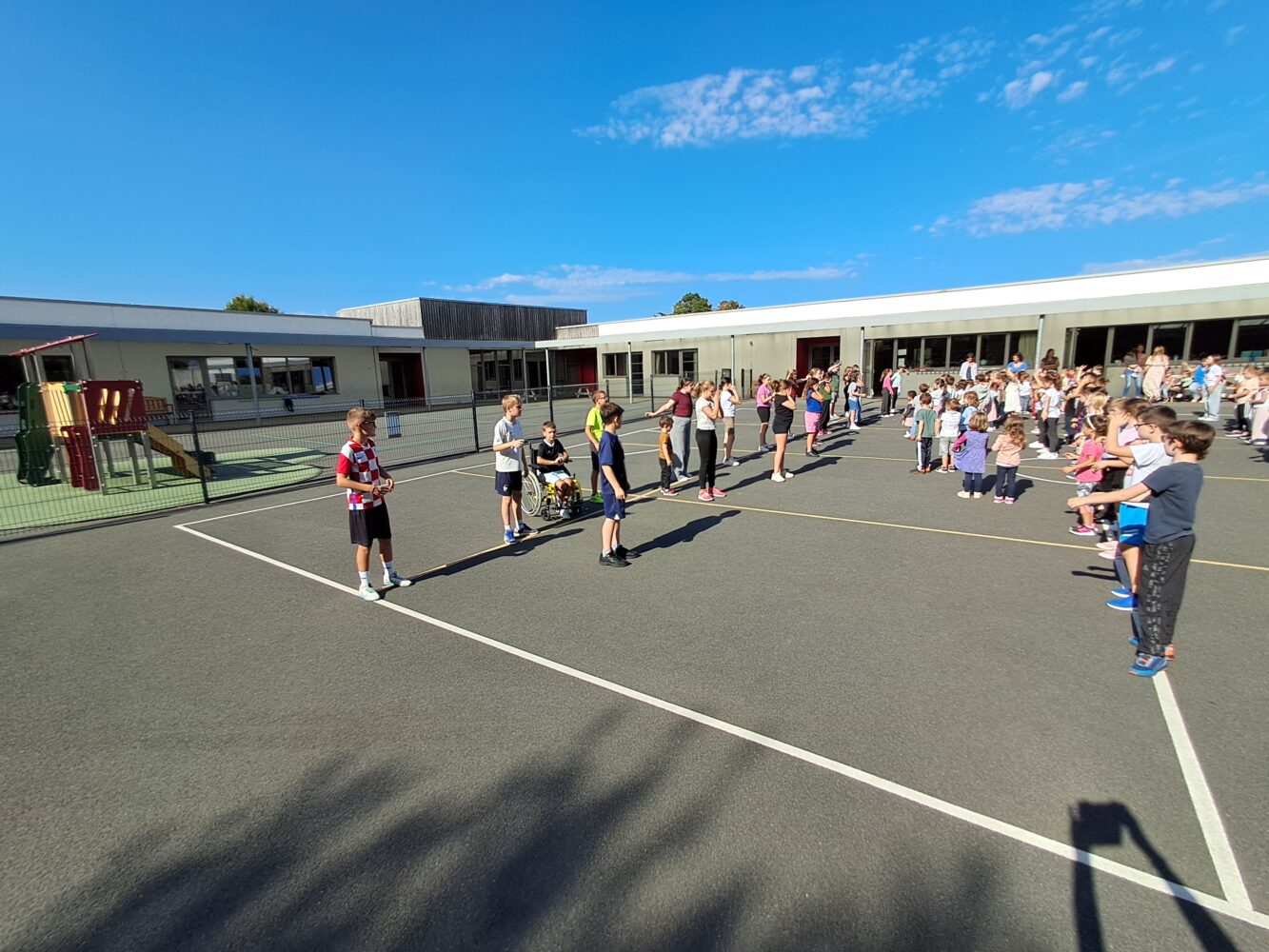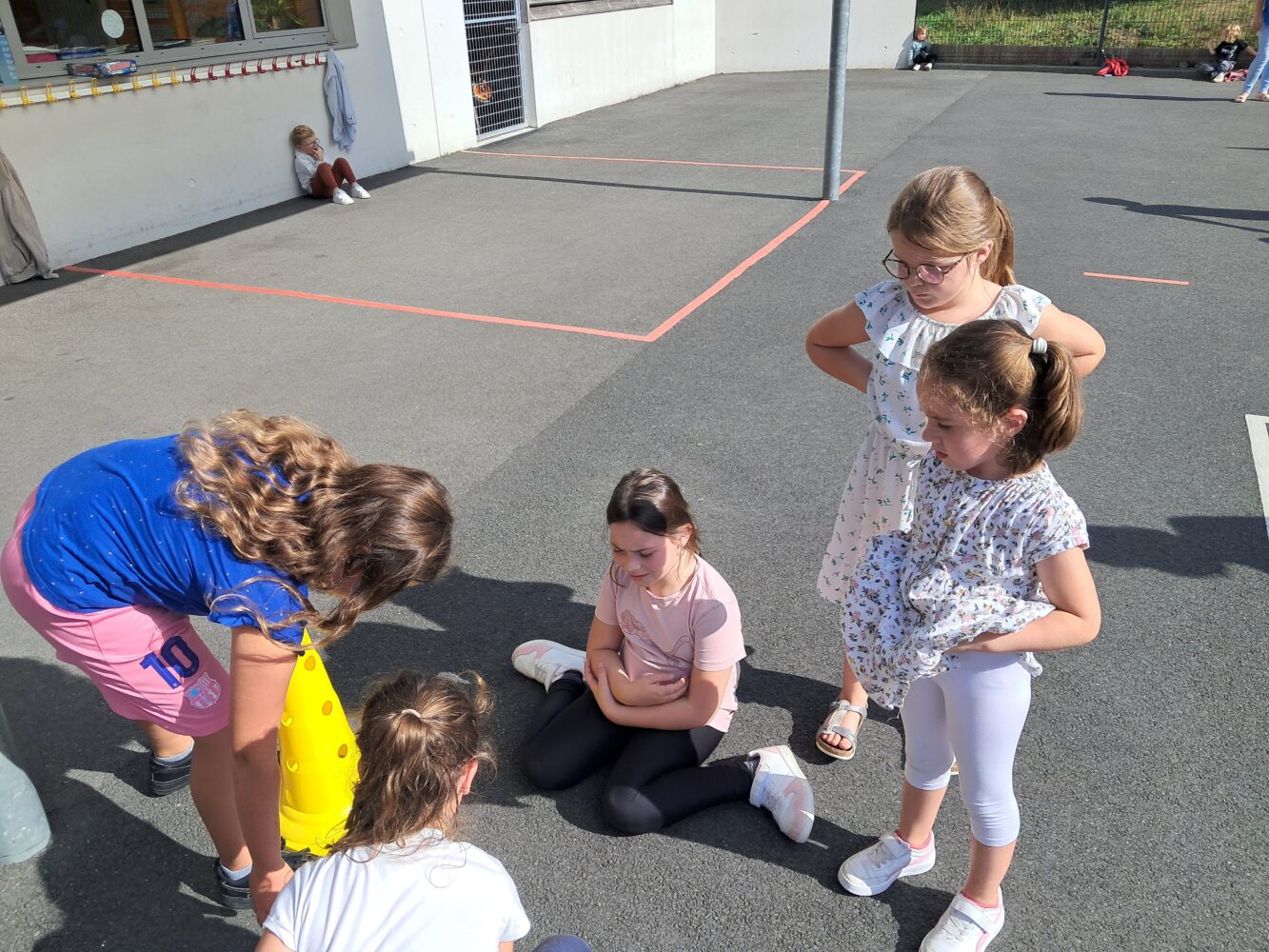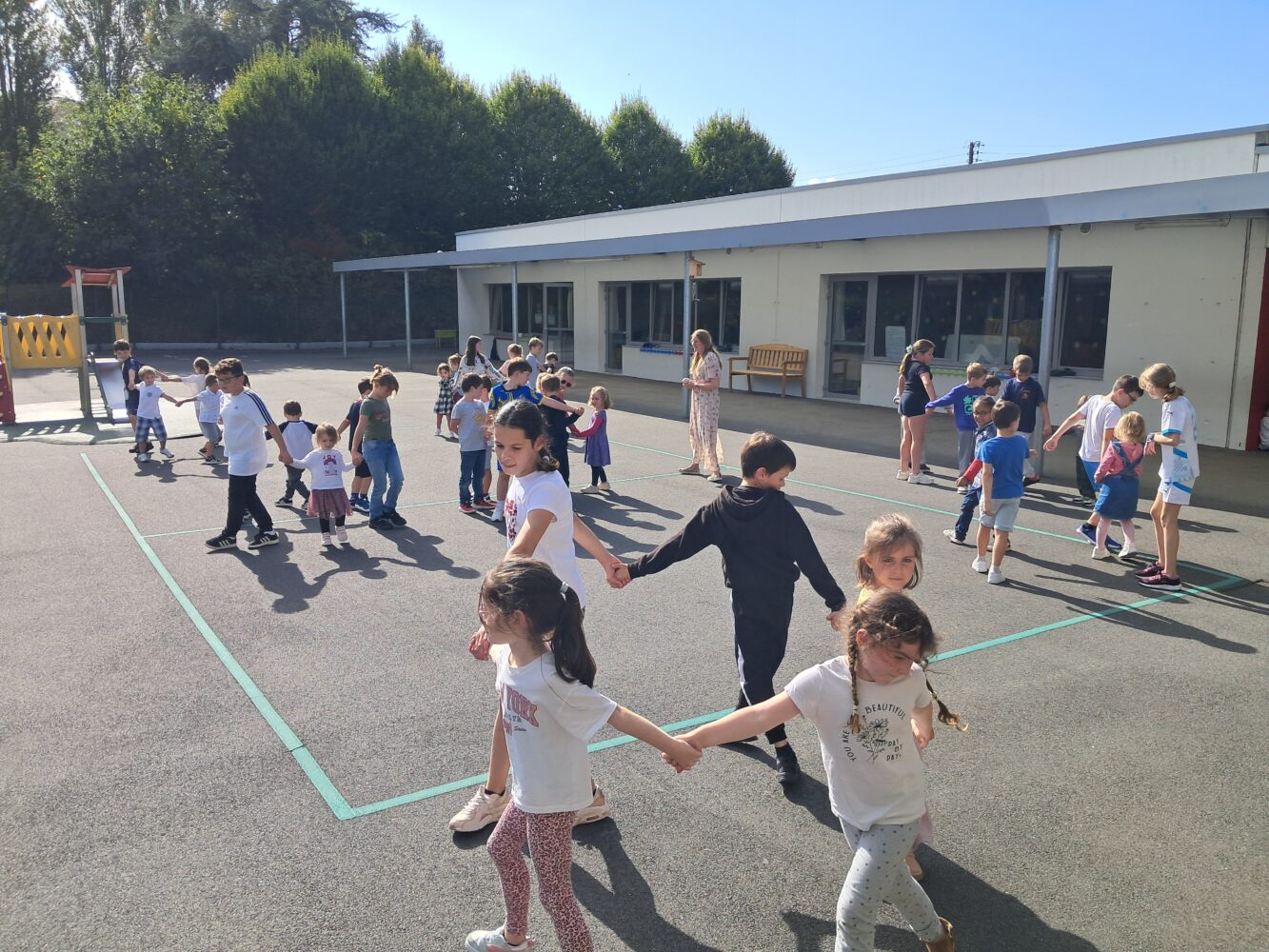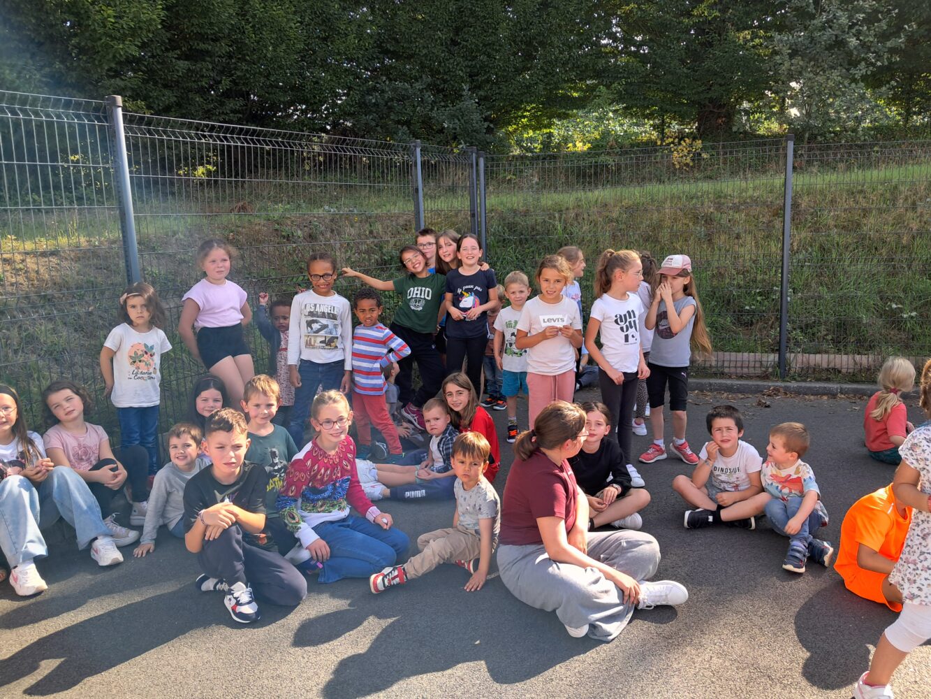 Ce vendredi après-midi 19 septembre, le soleil et la chaleur ont accompagné tous les élèves de l’école pour réaliser le jeu collectif de rentrée. Il fallait allier des compétences intellectuelles sur les régions de France à des postures sportives telles des rondes inversées, des passages de cerceau dans une chaîne humaine, des marches à reculons ou des mouvements d’athlétisme… Et pour finir, une chorégraphie sur la chanson « Unis comme des frères » de Hopen !