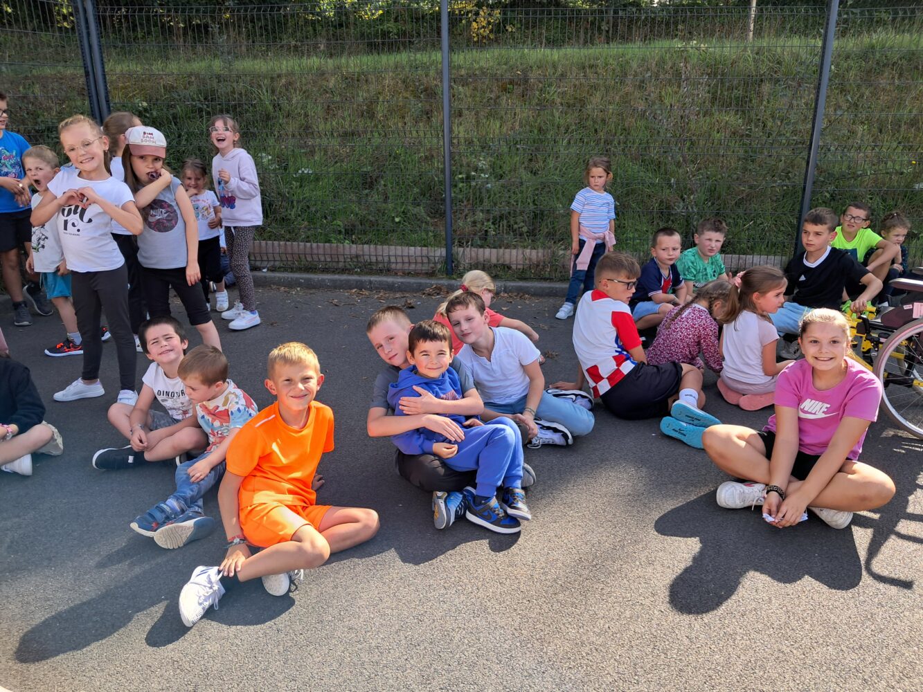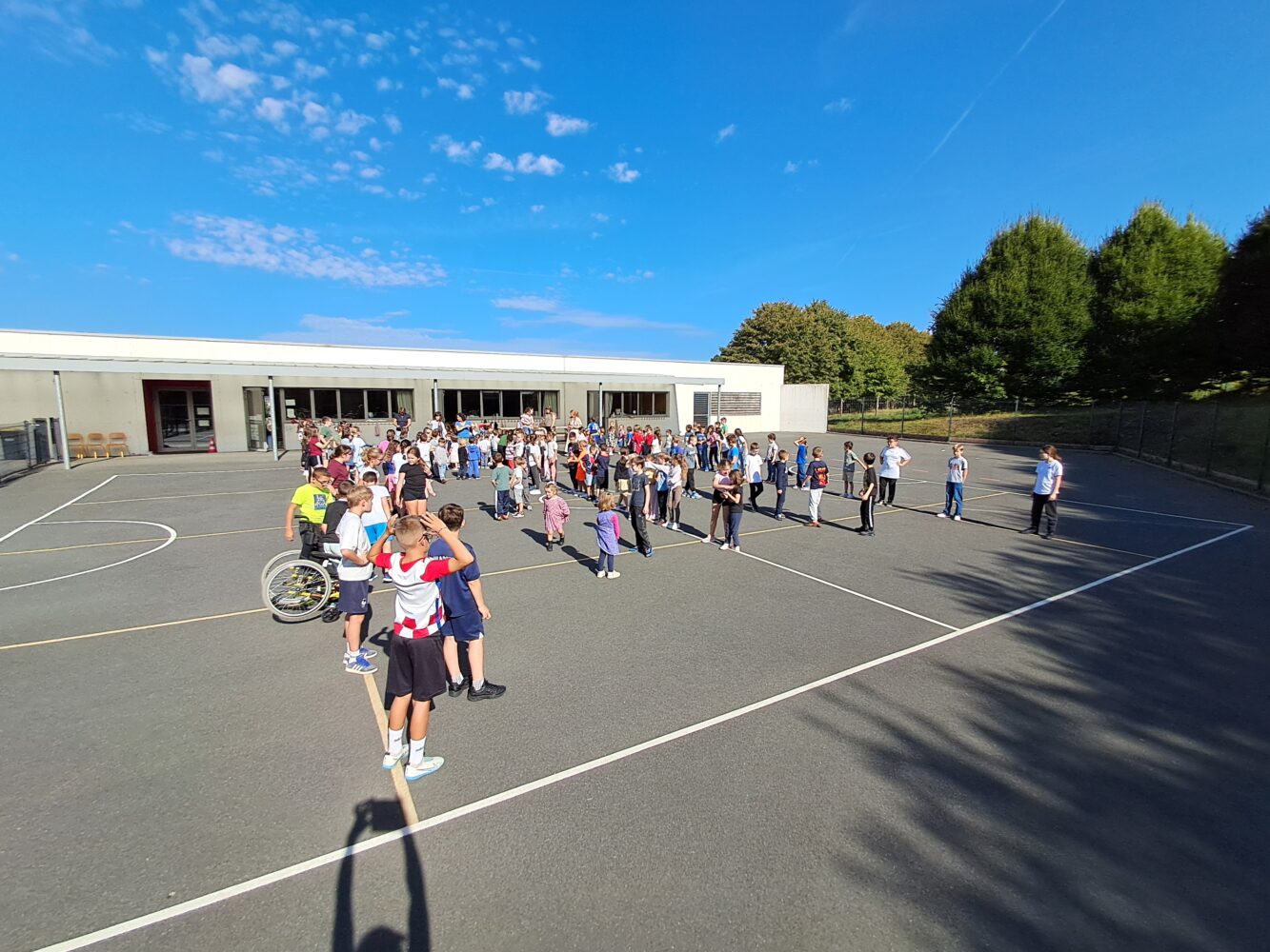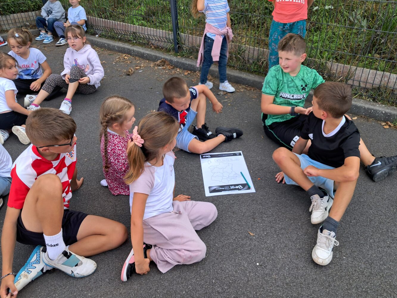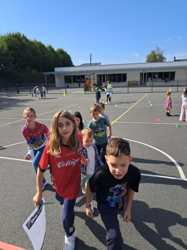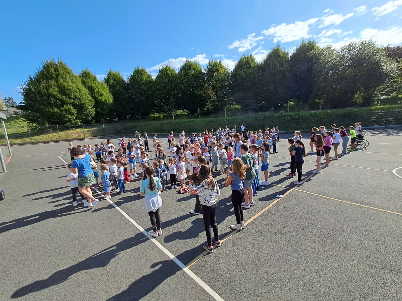 Ce vendredi après-midi 19 septembre, le soleil et la chaleur ont accompagné tous les élèves de l’école pour réaliser le jeu collectif de rentrée. Il fallait allier des compétences intellectuelles sur les régions de France à des postures sportives telles des rondes inversées, des passages de cerceau dans une chaîne humaine, des marches à reculons ou des mouvements d’athlétisme… Et pour finir, une chorégraphie sur la chanson « Unis comme des frères » de Hopen !