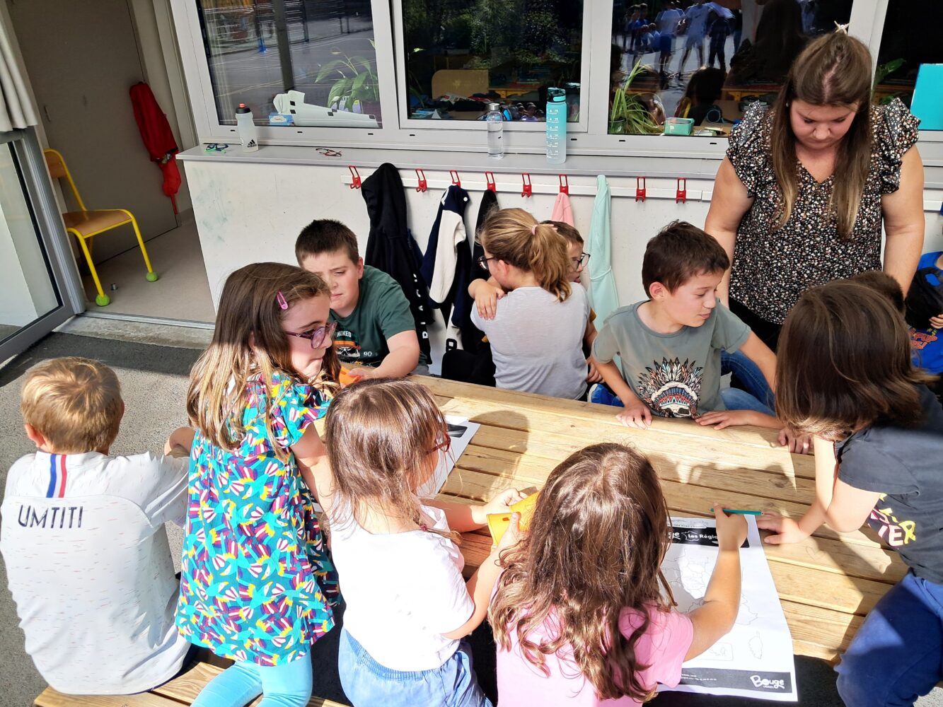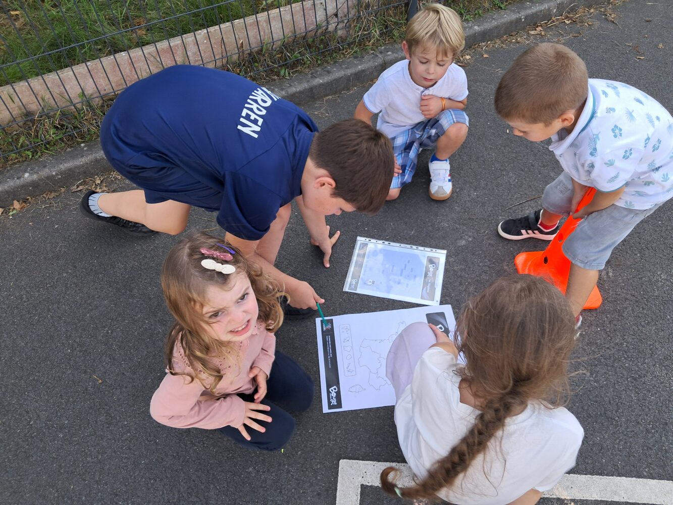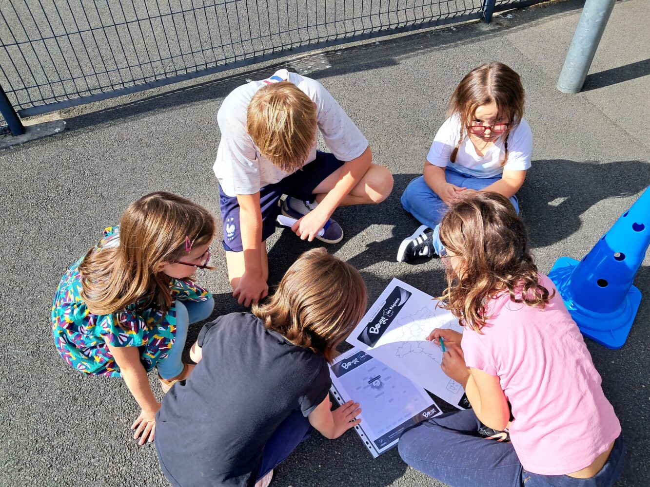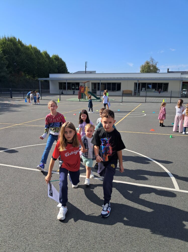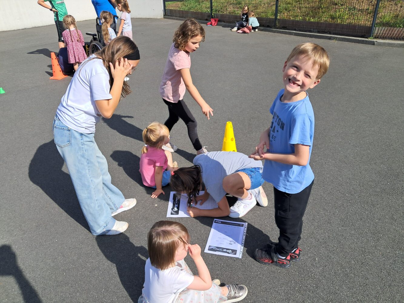 Ce vendredi après-midi 19 septembre, le soleil et la chaleur ont accompagné tous les élèves de l’école pour réaliser le jeu collectif de rentrée. Il fallait allier des compétences intellectuelles sur les régions de France à des postures sportives telles des rondes inversées, des passages de cerceau dans une chaîne humaine, des marches à reculons ou des mouvements d’athlétisme… Et pour finir, une chorégraphie sur la chanson « Unis comme des frères » de Hopen !